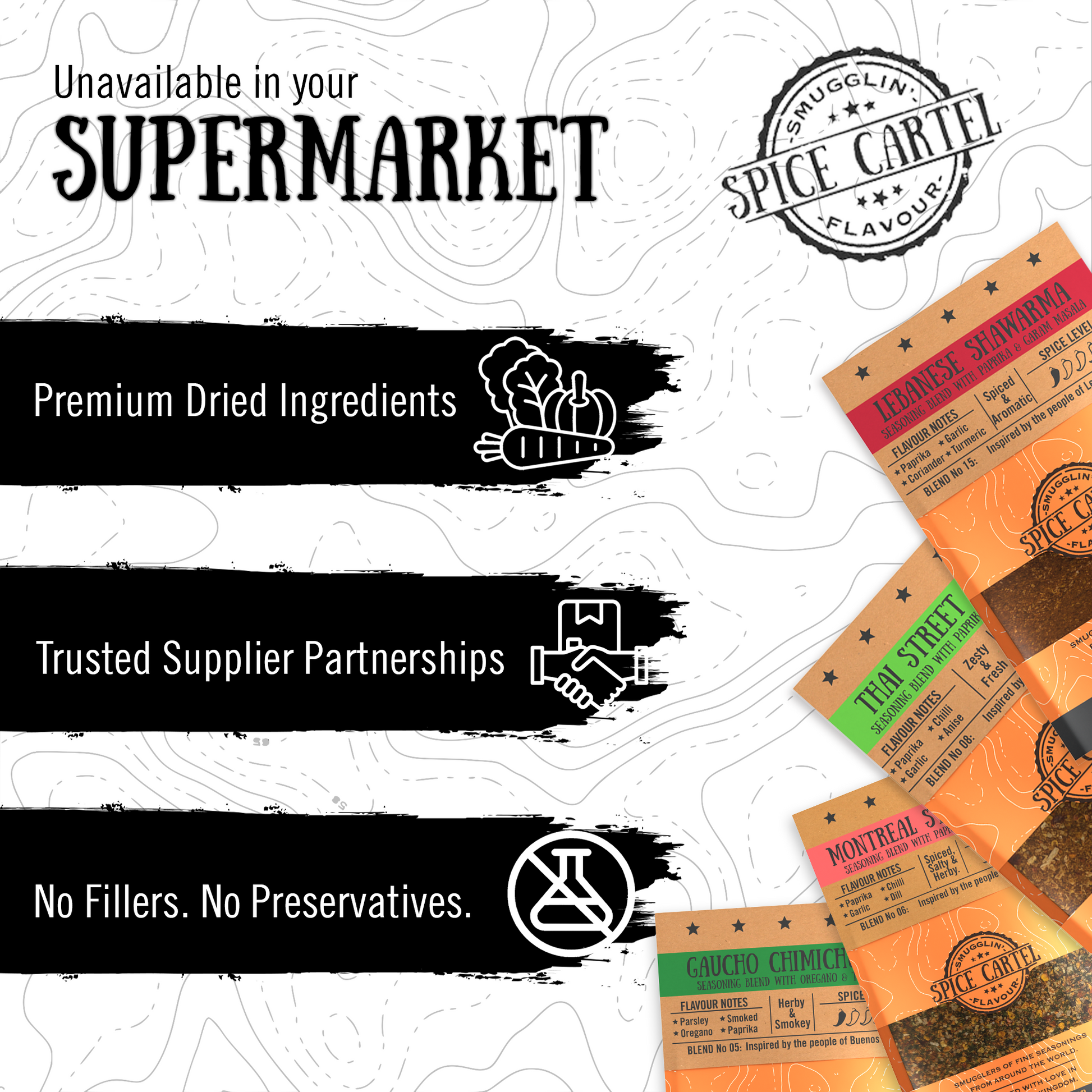 Thai Street Food: Paprika, Salt, Garlic, Onion, Coriander, Lemongrass, Chilli, Star Anise, Black Pepper.